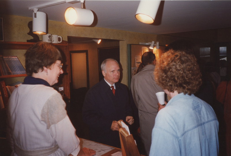 Brian Lamb stands near a person who is at a store counter and another person whose back is turned to the camera. This photograph was taken as part of filming C-SPAN's Lincoln-Douglas Debates series in Galesburg, Illinois.