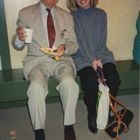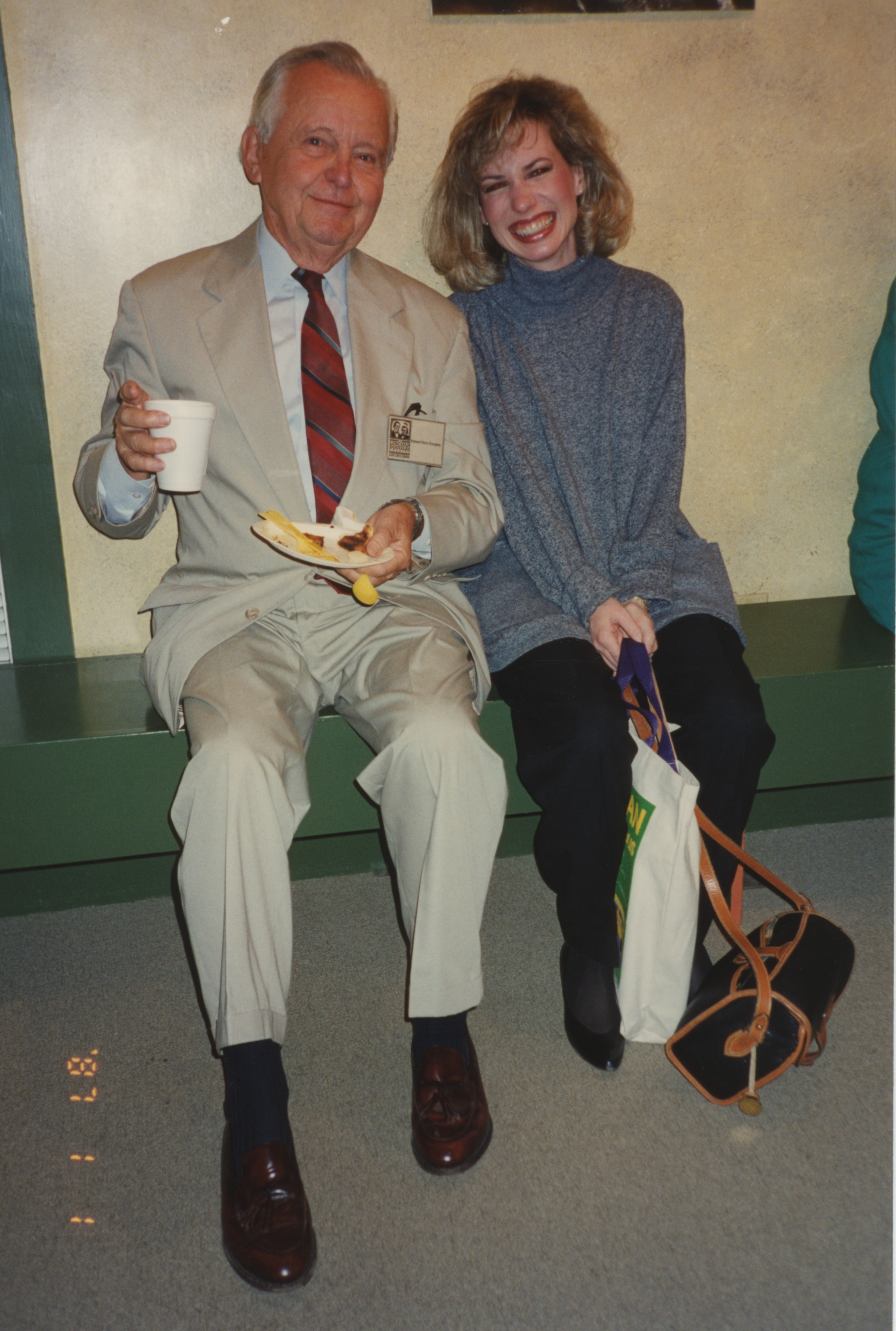 Lea Anne Long (right) sits with a person holding a small styrofoam plate and cup. This photograph was taken as part of filming C-SPAN's Lincoln-Douglas Debates series in Galesburg, Illinois.