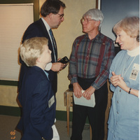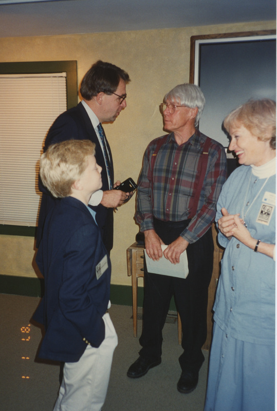 Nick Earl and Carol Nelson speaking with others, Galesburg, Illinois