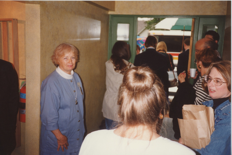 Carol Nelson, the Carl Sandburg State Historic Site Manager, stands in a crowded room near an exterior door of the Carl Sandburg State Historic Site. This photograph was taken as part of filming C-SPAN's Lincoln-Douglas Debates series in Galesburg, Illinois.