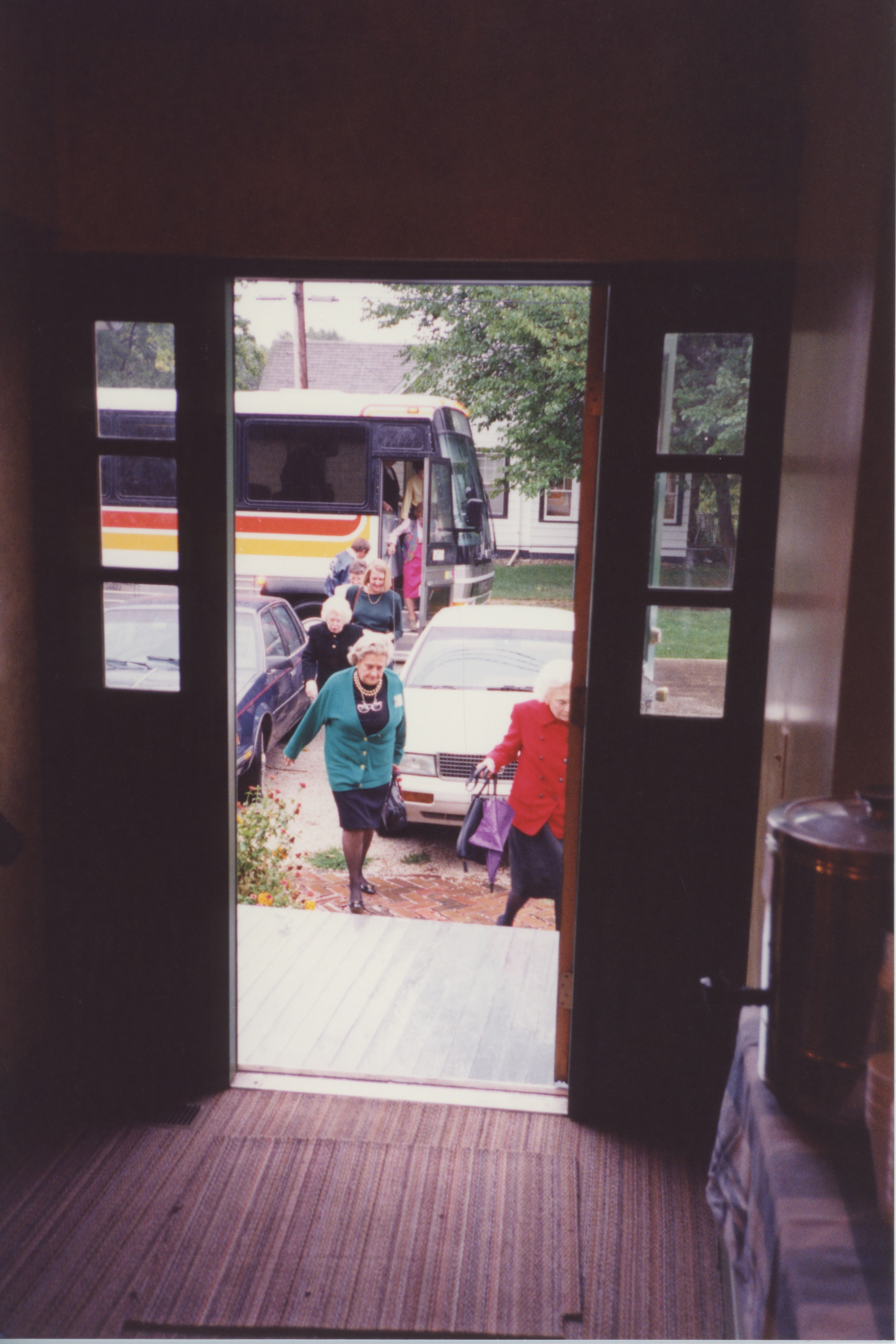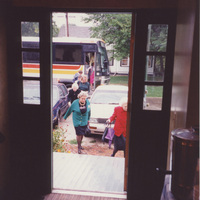 A group of people exit a bus, as seem from the open front door of a buiding. This photograph was taken as part of filming C-SPAN's Lincoln-Douglas Debates series in Galesburg, Illinois.