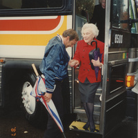 A person holding an umbrella lends a hand to an elderly person exiting a bus. This photograph was taken as part of filming C-SPAN's Lincoln-Douglas Debates series in Galesburg, Illinois.