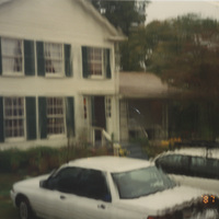 A blurry image of a white house with green shutters and two white cars parked out front. This photograph was taken as part of filming C-SPAN's Lincoln-Douglas Debates series in Galesburg, Illinois.