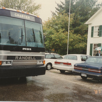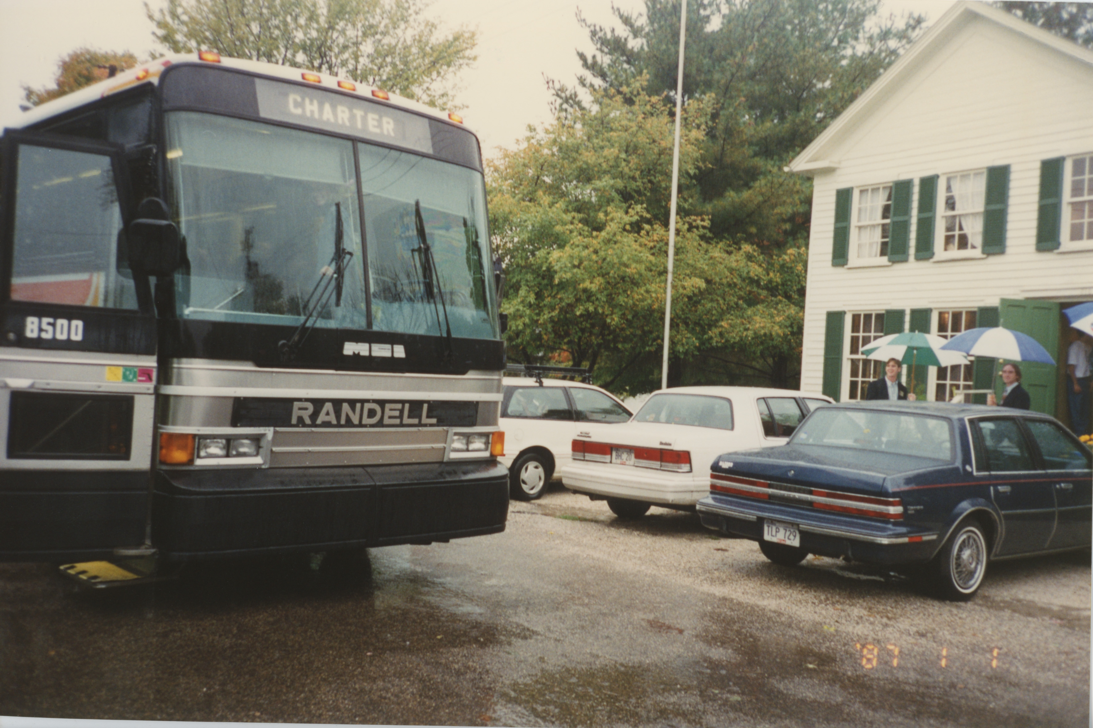 A Randell charter bus with an open door is parked outside a white home with green shutters, as individuals holding umbrellas stand outside. This photograph was taken as part of filming C-SPAN's Lincoln-Douglas Debates series in Galesburg, Illinois.
