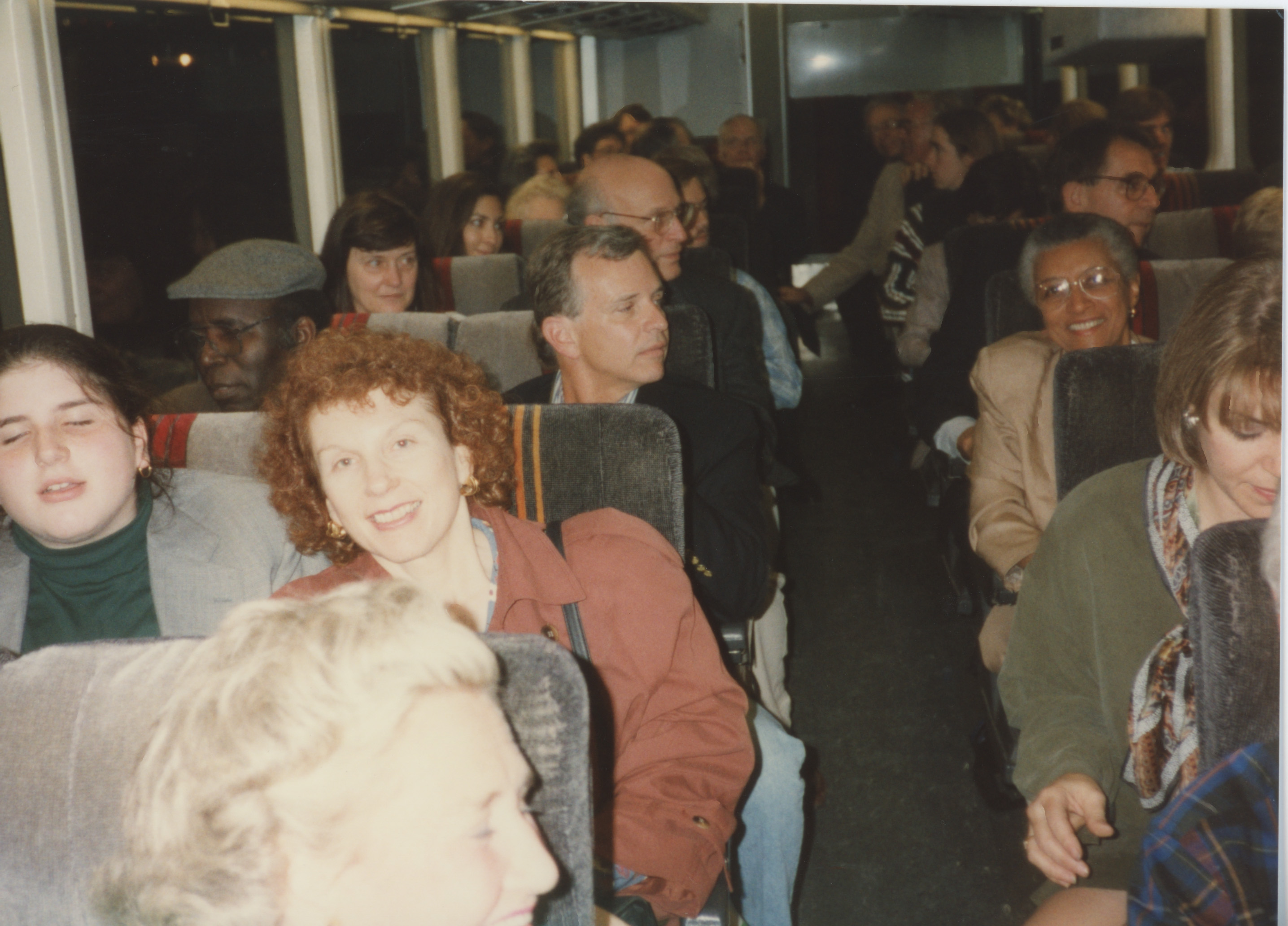 A group of people sit in seats on a charter bus. This photograph was taken as part of filming C-SPAN's Lincoln-Douglas Debates series in Galesburg, Illinois.