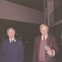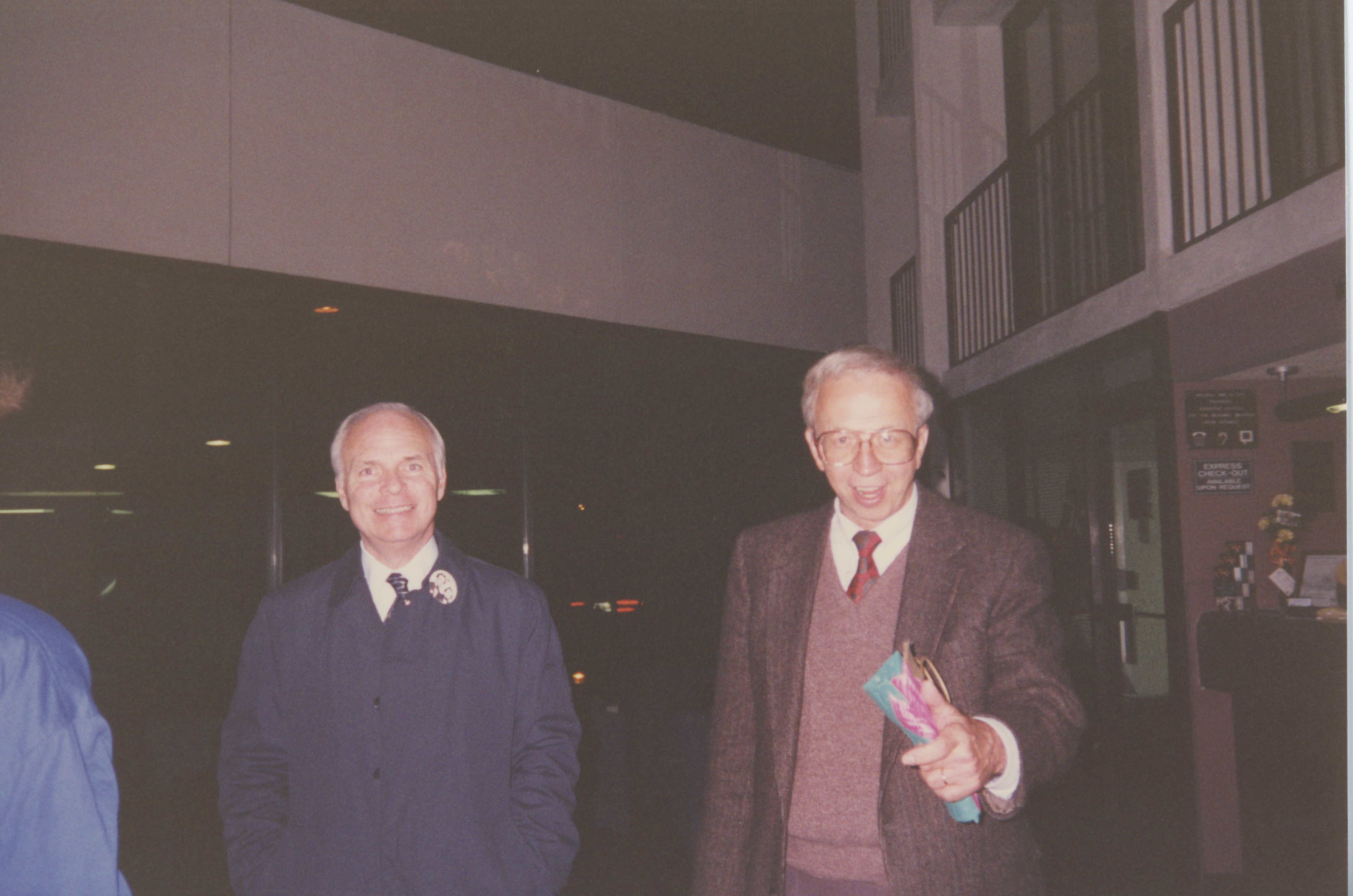 Brian Lamb stands next to another person near a building. This photograph was taken as part of filming C-SPAN's Lincoln-Douglas Debates series in Galesburg, Illinois.
