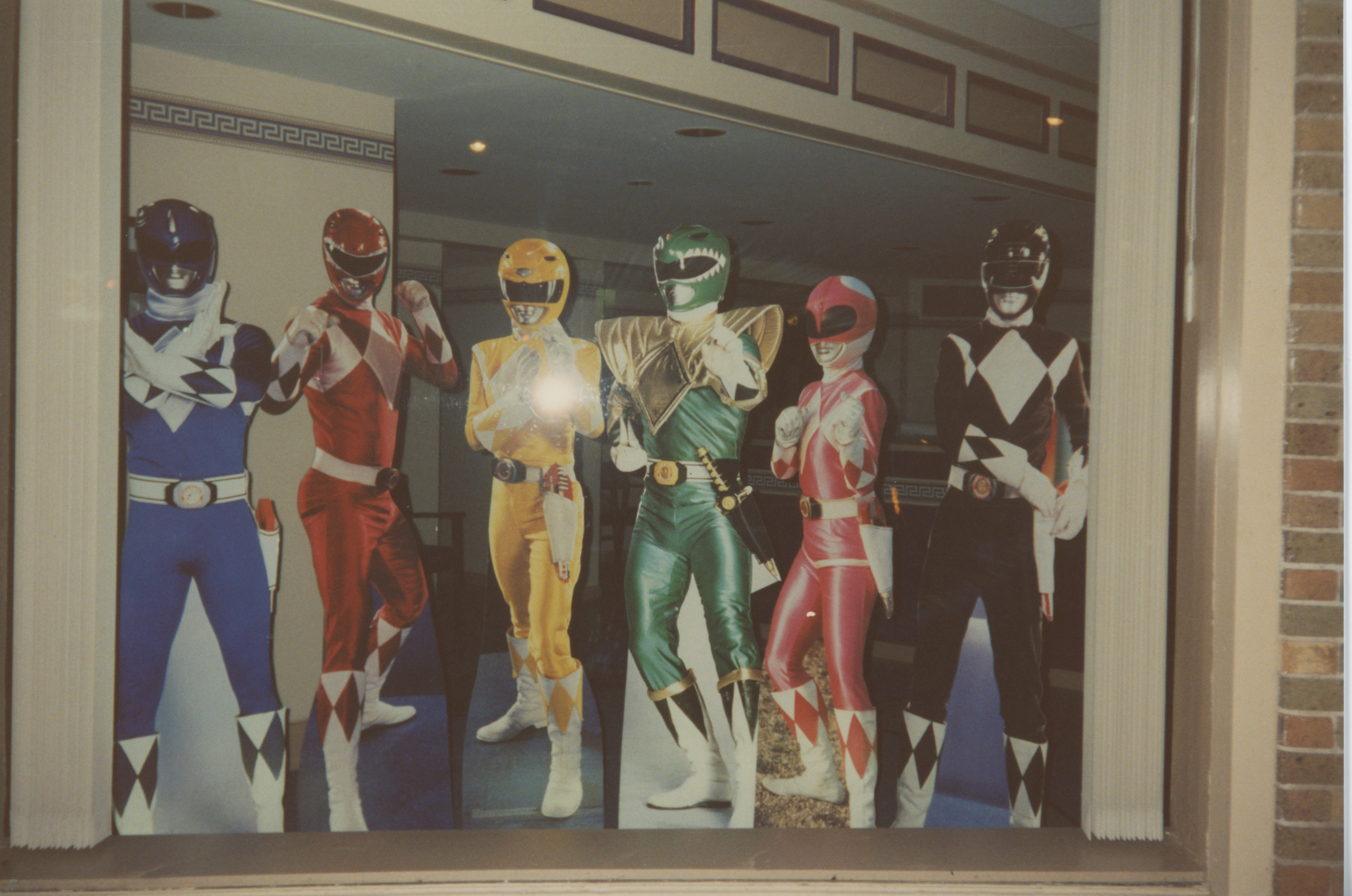 Six large cardboard cutouts of the Power Rangers characters. This photograph was taken as part of filming C-SPAN's Lincoln-Douglas Debates series in Galesburg, Illinois.