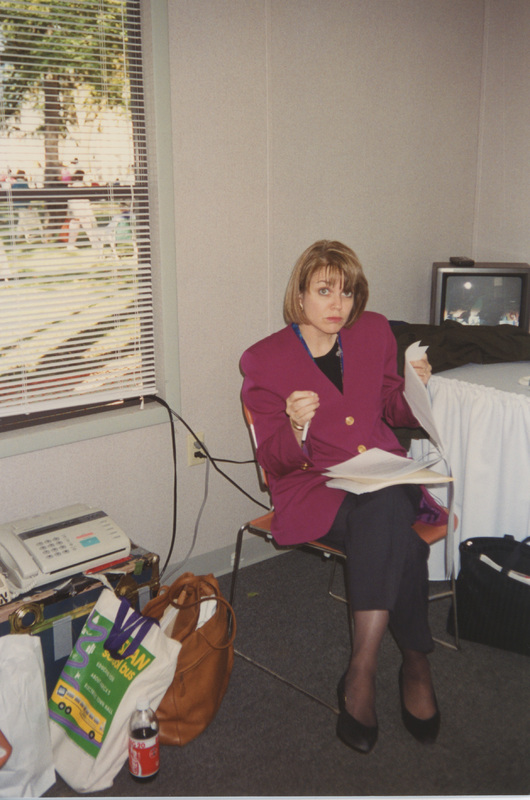 Susan Swain sits in a chair reading some papers, while a television and some bags are around her. This photograph was taken as part of filming C-SPAN's Lincoln-Douglas Debates series in Quincy, Illinois.