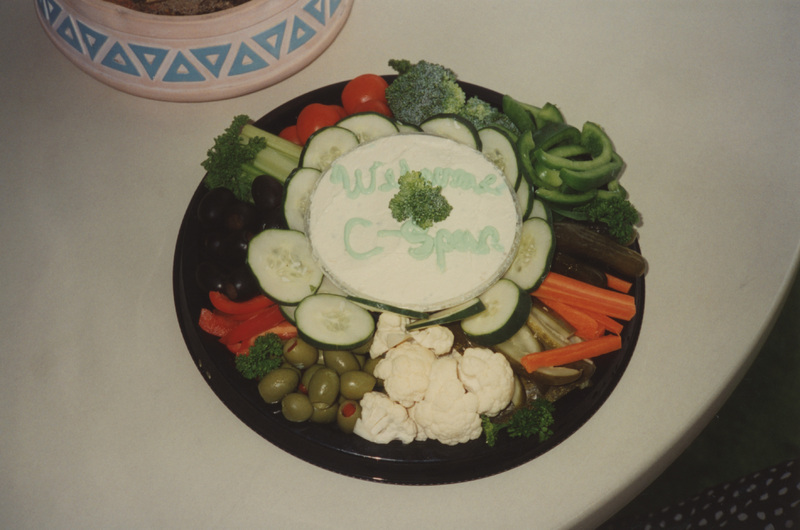 View of a vegetable platter with peppers, cauliflower, olives, cucumber, tomatoes, carrots, and other vegetables with a dip decorated with the words "Welcome C-SPAN." This photograph was taken as part of filming C-SPAN's Lincoln-Douglas Debates series in Quincy, Illinois.
