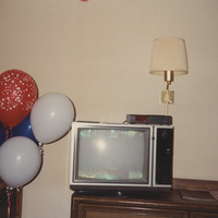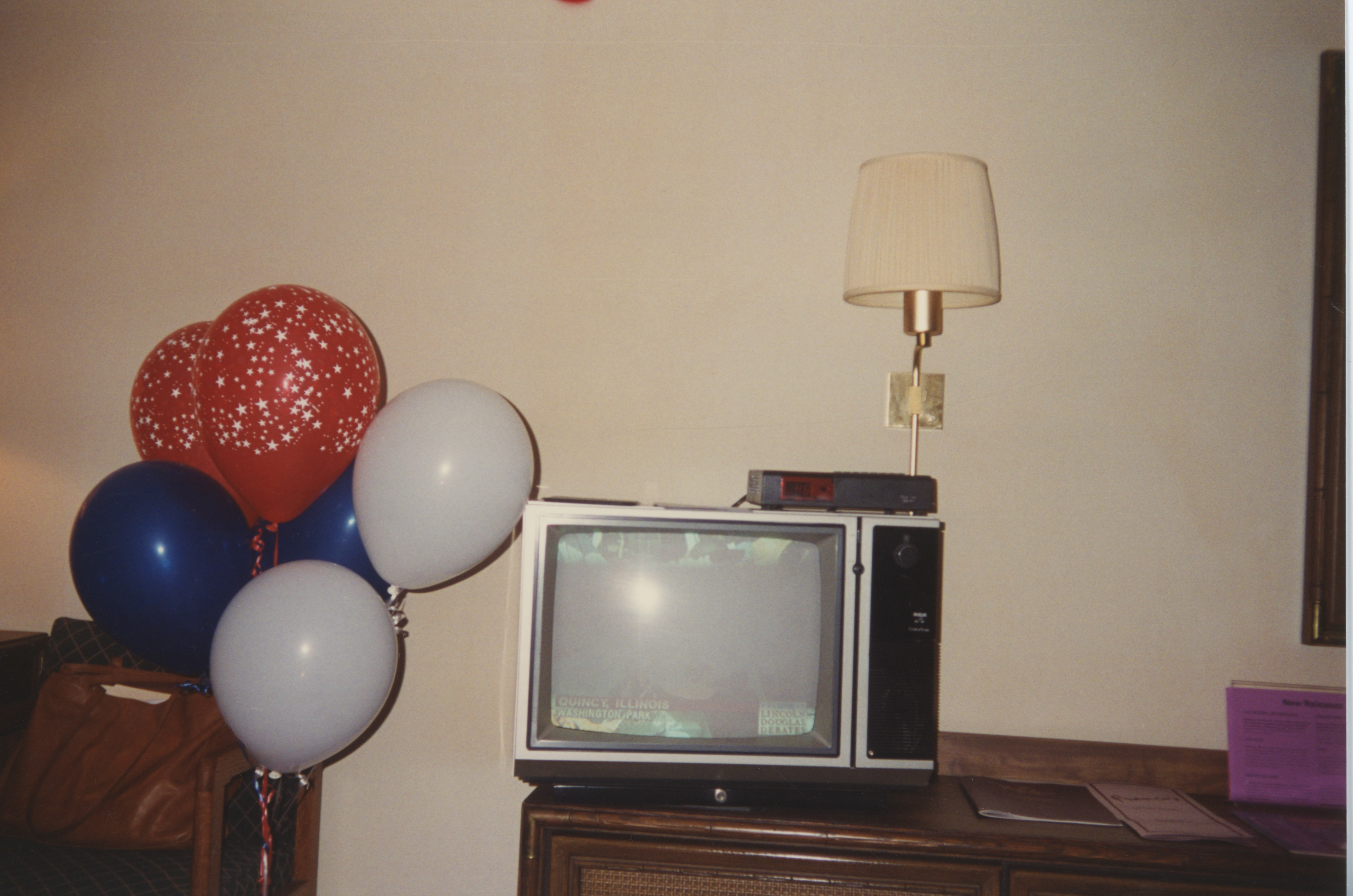 View of a television, with blue, white, and red starred balloons next to it. This photograph was taken as part of filming C-SPAN's Lincoln-Douglas Debates series in Quincy, Illinois.