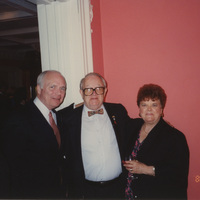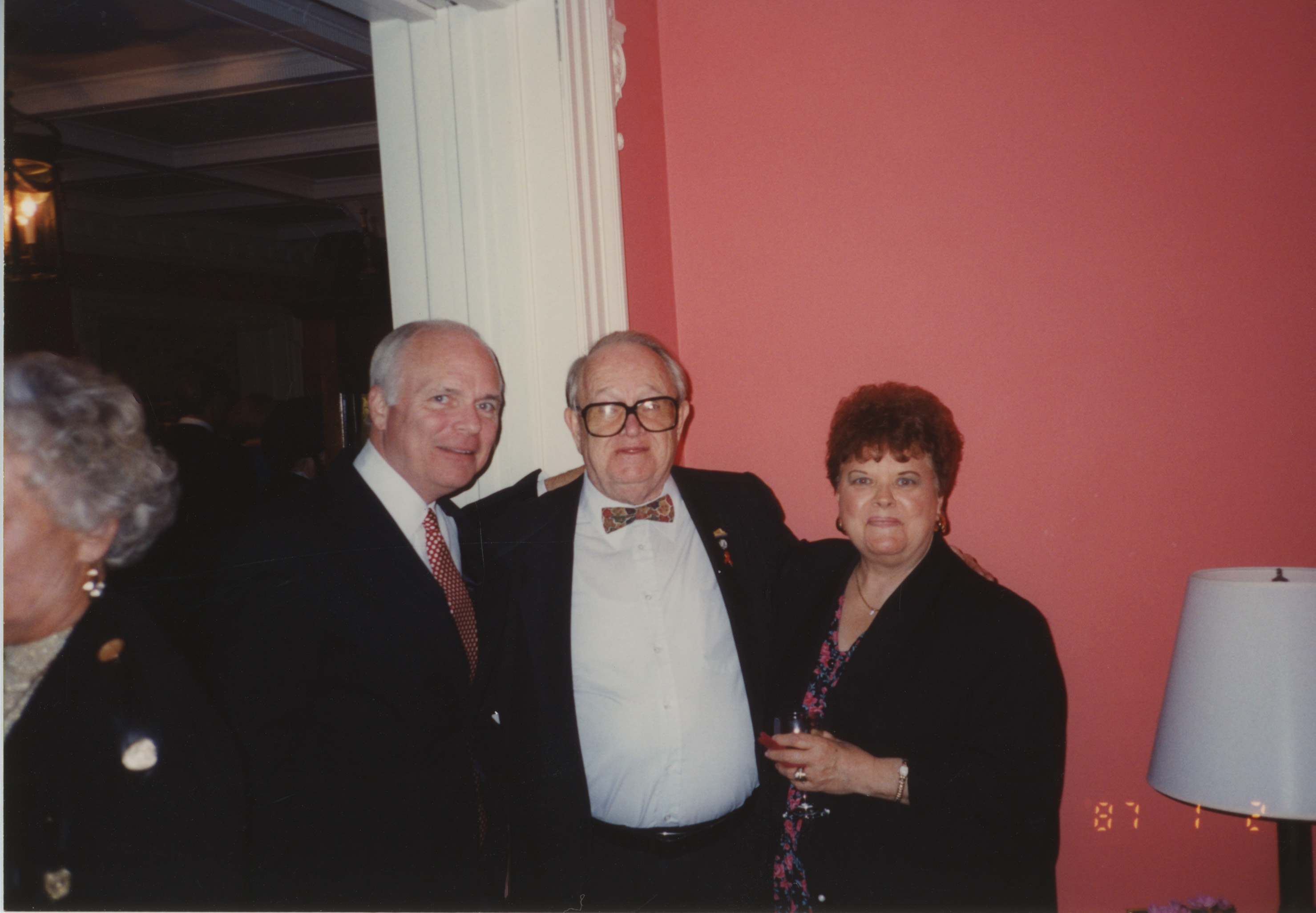 Brian Lamb stands with his arm around a man wearing a suit and bowtie, who stands next to another person holding a glass. This photograph was taken as part of filming C-SPAN's Lincoln-Douglas Debates series in Quincy, Illinois.