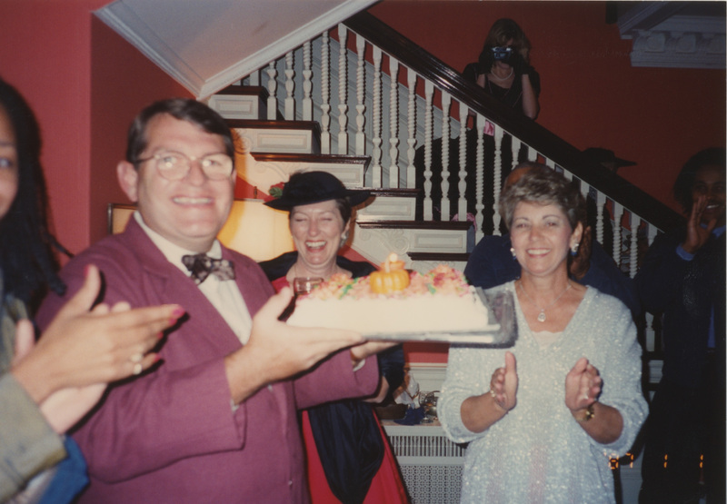 A person holds a cake while other people clap and someone captures a picture from a staircase nearby. This photograph was taken as part of filming C-SPAN's Lincoln-Douglas Debates series in Quincy, Illinois.