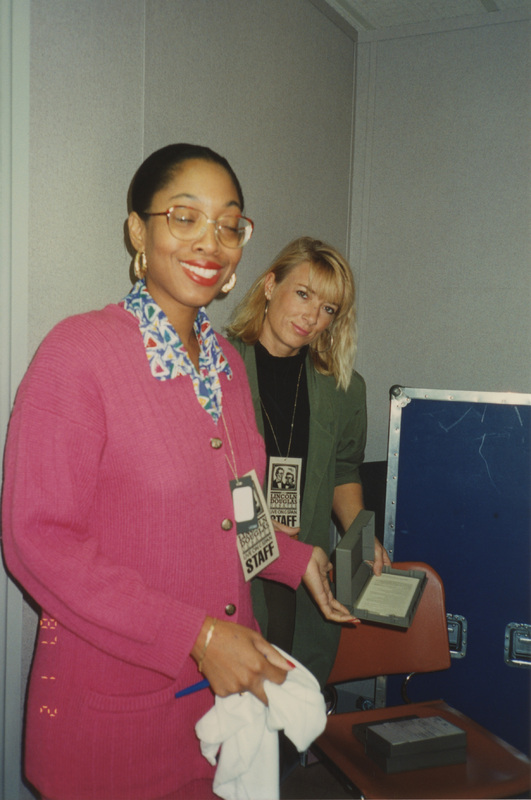 A young person wearing a magenta sweater and skirt and wearing a Lincoln-Douglas Debates Staff badge stands with another person wearing a Lincoln-Douglas Debates Staff badge and holding a small box. This photograph was taken as part of filming C-SPAN's Lincoln-Douglas Debates series in Quincy, Illinois.