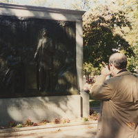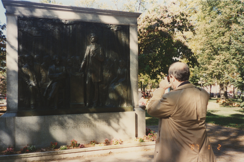 A person takes a picture of a large bronze plaque depicting Abraham Lincoln; the caption on the plaque says "Lincoln-Douglas Debate, Quincy, October 13, 1858." This photograph was taken as part of filming C-SPAN's Lincoln-Douglas Debates series in Quincy, Illinois.