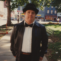A person wearing a suit, bowtie, and bowler hat poses outdoors. This photograph was taken as part of filming C-SPAN's Lincoln-Douglas Debates series in Quincy, Illinois.