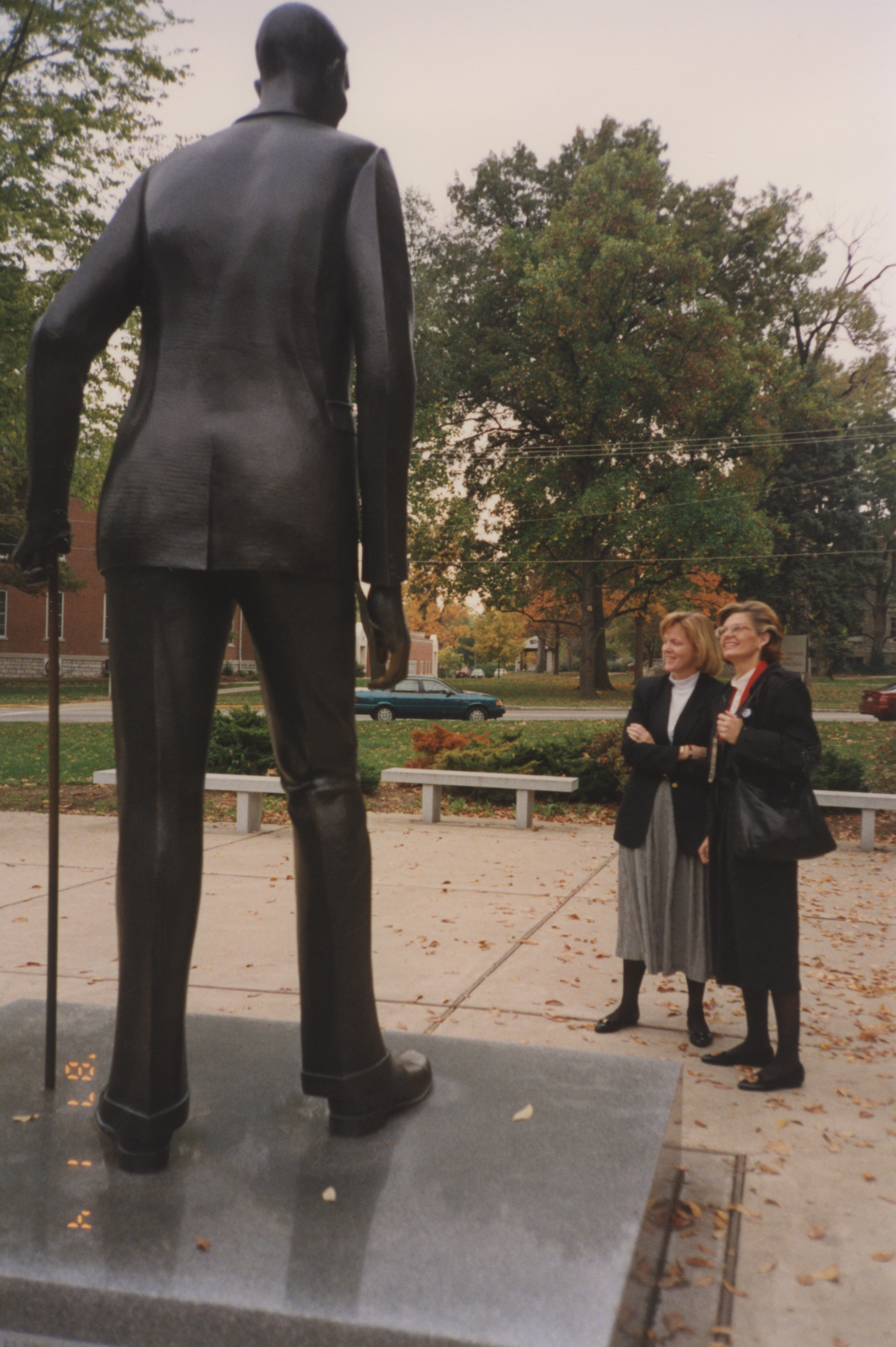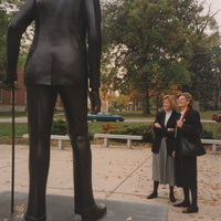 Susan Swain and someone else stand near an outdoor statue of Robert Pershing Wadlow. This photograph was taken as part of filming C-SPAN's Lincoln-Douglas Debates series in Alton, Illinois.