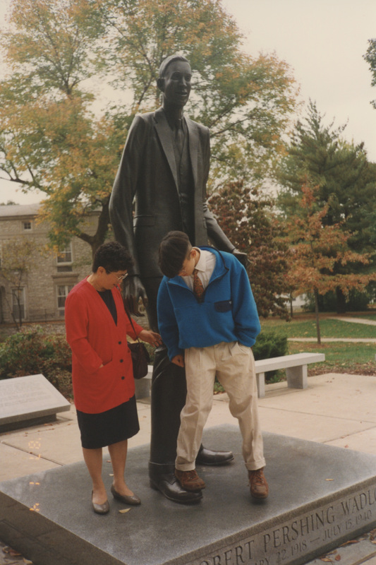 People on platform with Robert Pershing Wadlow statue, Alton, Illinois