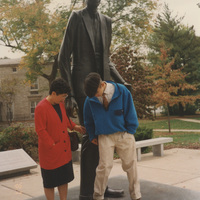Two people stand on a platform with a statue of Robert Pershing Wadlow. The statue plaque reads "Robert Pershing Wadlow, February 12, 1918 - July 15, 1940." This photograph was taken as part of filming C-SPAN's Lincoln-Douglas Debates series in Alton, Illinois.