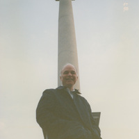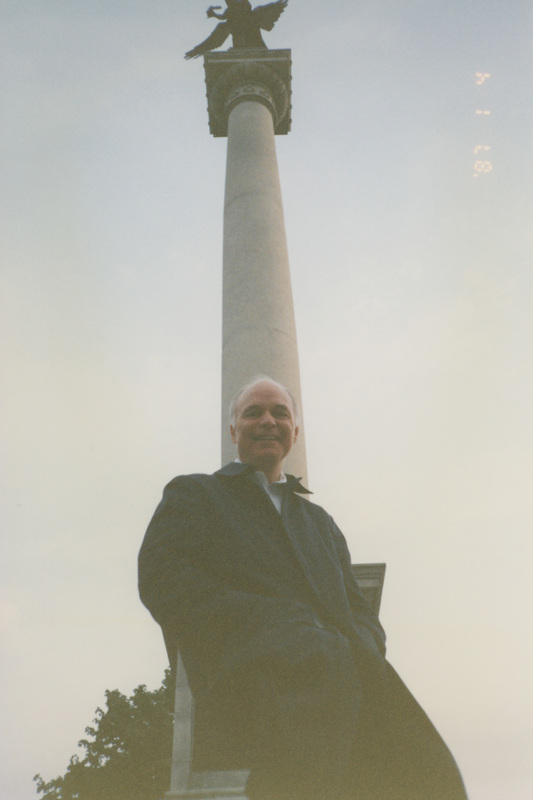 Brian Lamb poses near a tall, outdoor column topped with a winged figure. This photograph was taken as part of filming C-SPAN's Lincoln-Douglas Debates series in Alton, Illinois.