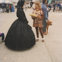 A young person speaks to a person in a long, black, 19th-century period dress near an outdoor fair. This photograph was taken as part of filming C-SPAN's Lincoln-Douglas Debates series in Galesburg, Illinois.