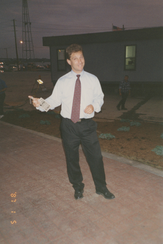 A person poses outdoors holding his Lincoln-Douglas Debate Staff badge. This photograph was taken as part of filming C-SPAN's Lincoln-Douglas Debates series in Alton, Illinois.