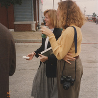 Two people stand near a street corner, speaking with others who are out of frame. This photograph was taken as part of filming C-SPAN's Lincoln-Douglas Debates series in Alton, Illinois.