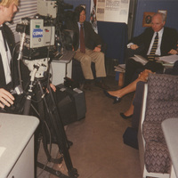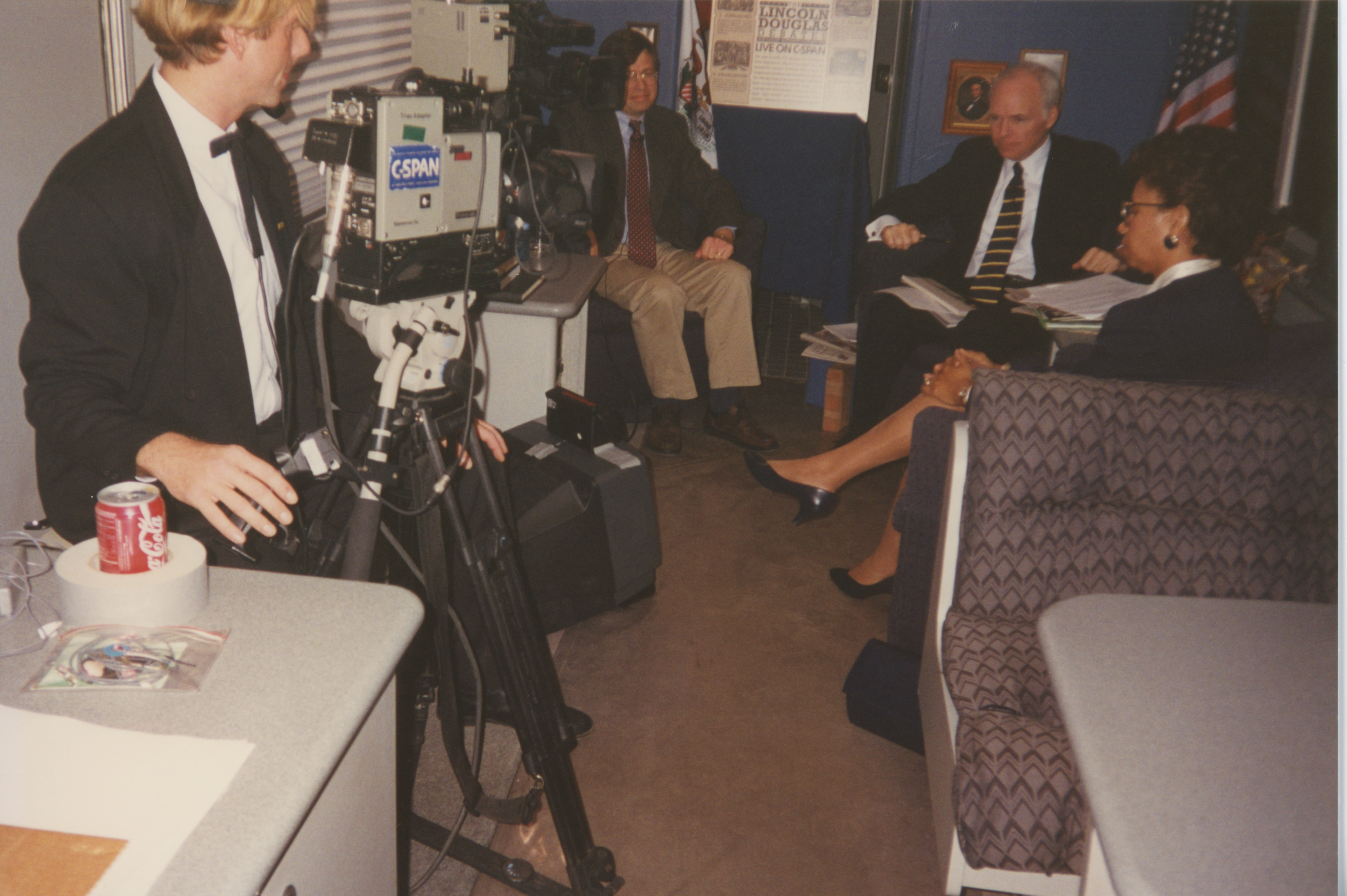 Brian Lamb and others sit in a area with production equipment while a cameraperson sits at a C-SPAN camera. This photograph was taken as part of filming C-SPAN's Lincoln-Douglas Debates series in Alton, Illinois.