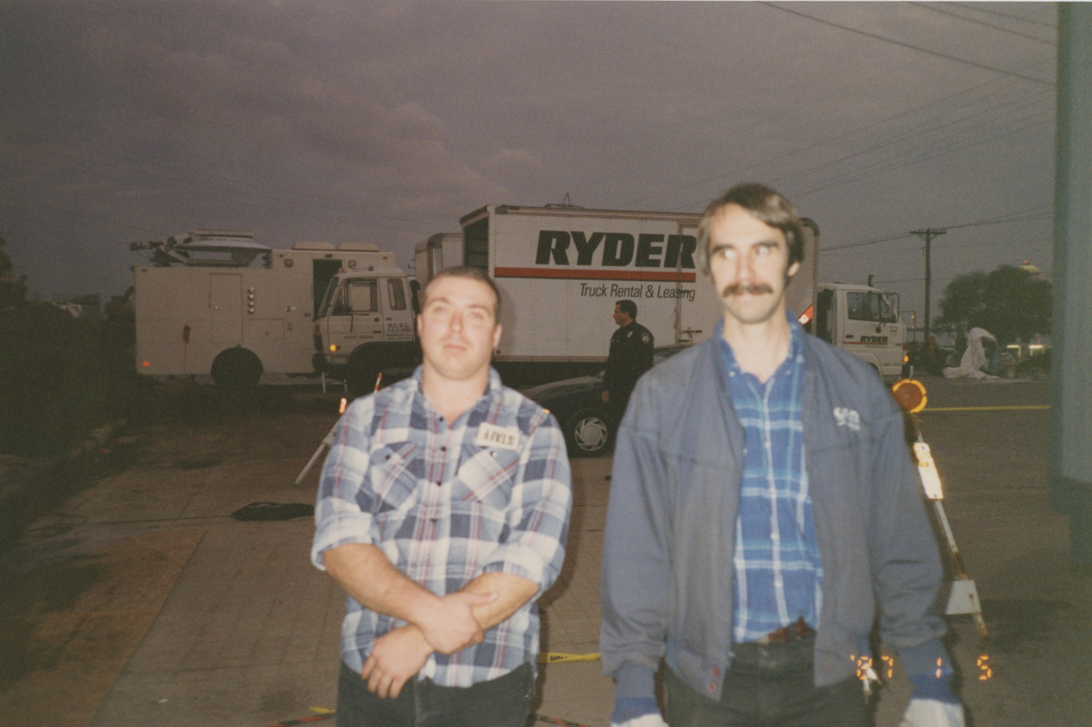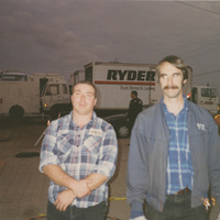Two people pose outdoors with large cargo trucks in the background. This photograph was taken as part of filming C-SPAN's Lincoln-Douglas Debates series in Alton, Illinois.