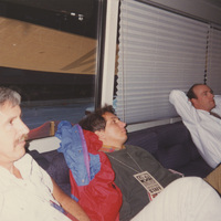 Three people lounge on a long couch, possibly in the C-SPAN Bus. This photograph was taken as part of filming C-SPAN's Lincoln-Douglas Debates series in Alton, Illinois.