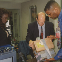 Two people wrap two boxes in duct tape while another person stands nearby and watches. This photograph was taken as part of filming C-SPAN's Lincoln-Douglas Debates series in Alton, Illinois.
