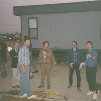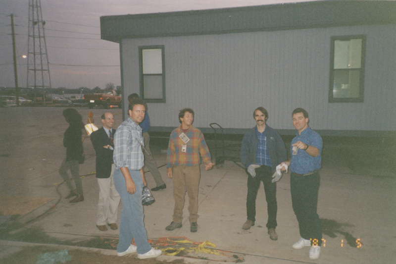 Several people stand outside a construction trailer. This photograph was taken as part of filming C-SPAN's Lincoln-Douglas Debates series in Alton, Illinois.