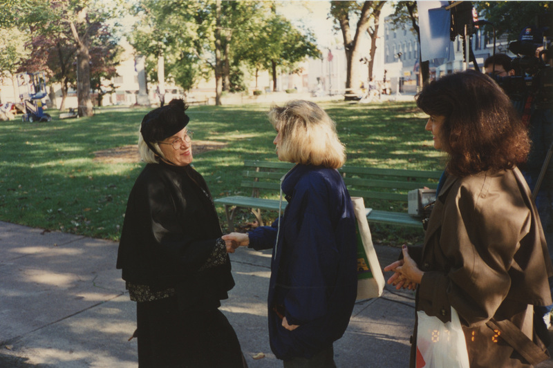 A person wearing 19th-century period costume shakes hands outdoors with another person, while a third person looks on. This photograph was taken as part of filming C-SPAN's Lincoln-Douglas Debates series in Alton, Illinois.