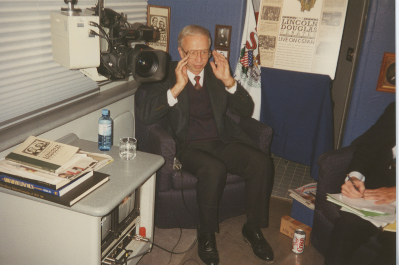 A person sits in a dark lounge chair near some production equipment, including a large camera. This photograph was taken as part of filming C-SPAN's Lincoln-Douglas Debates series in Alton, Illinois.