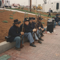 A group of apparent Civil War reenactors holding rifles sit on a sidewalk curb. This photograph was taken as part of filming C-SPAN's Lincoln-Douglas Debates series in Alton, Illinois.