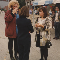 Three people stand outdoors near some pop-up tents and have a conversation. This photograph was taken as part of filming C-SPAN's Lincoln-Douglas Debates series in Alton, Illinois.