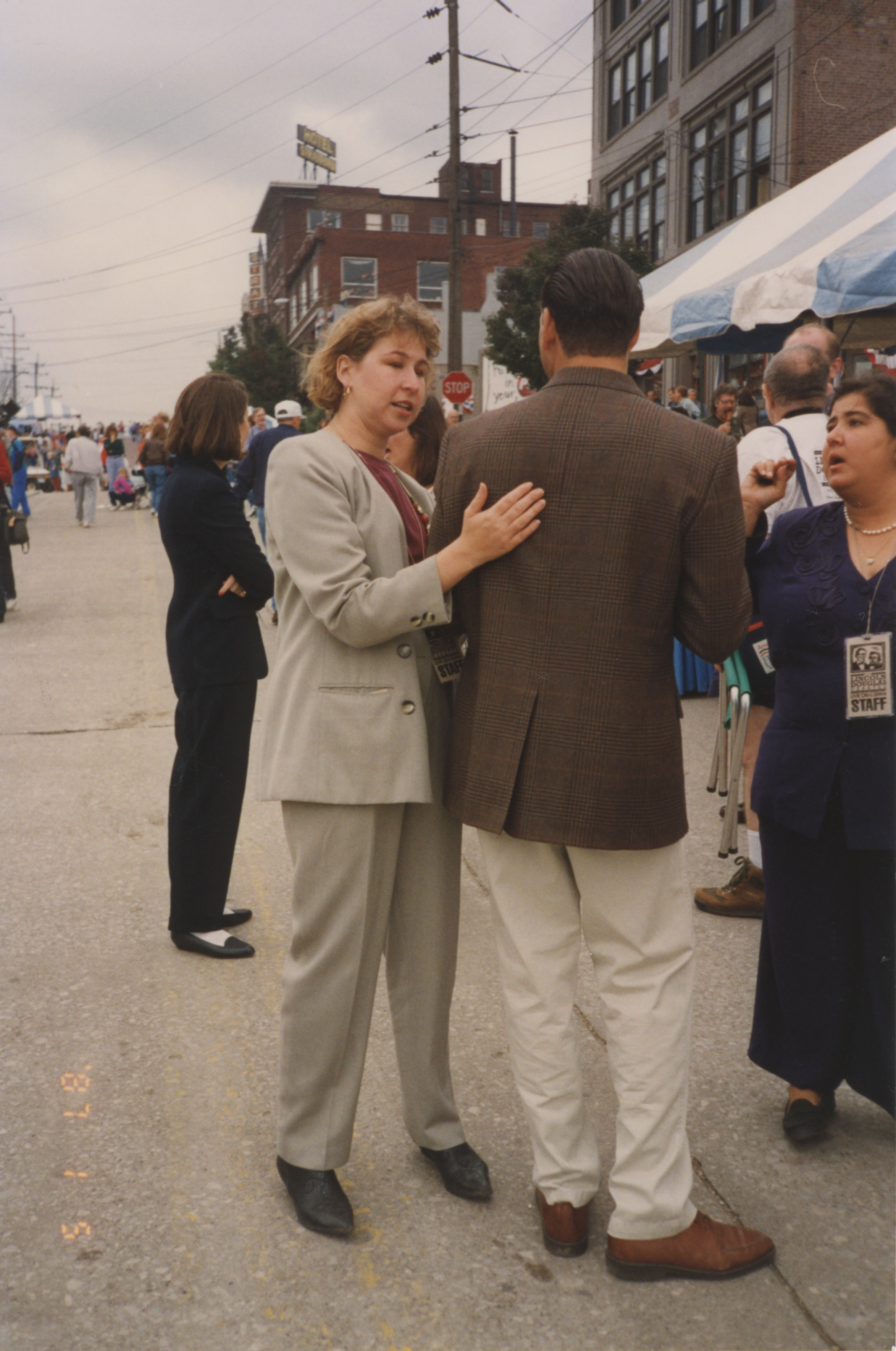A person pats someone else on the back as both stand outdoors in an empty road near some pavilions in an outdoor market. This photograph was taken as part of filming C-SPAN's Lincoln-Douglas Debates series in Alton, Illinois.