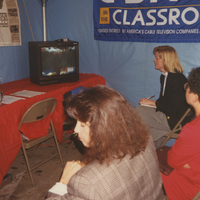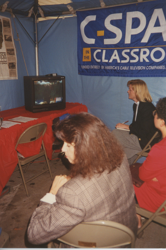 View of a television screen inside an outdoor pavilion with a "C-SPAN Classroom" banner; three seated on metal chairs people watch the television. This photograph was taken as part of filming C-SPAN's Lincoln-Douglas Debates series in Alton, Illinois.