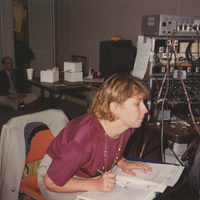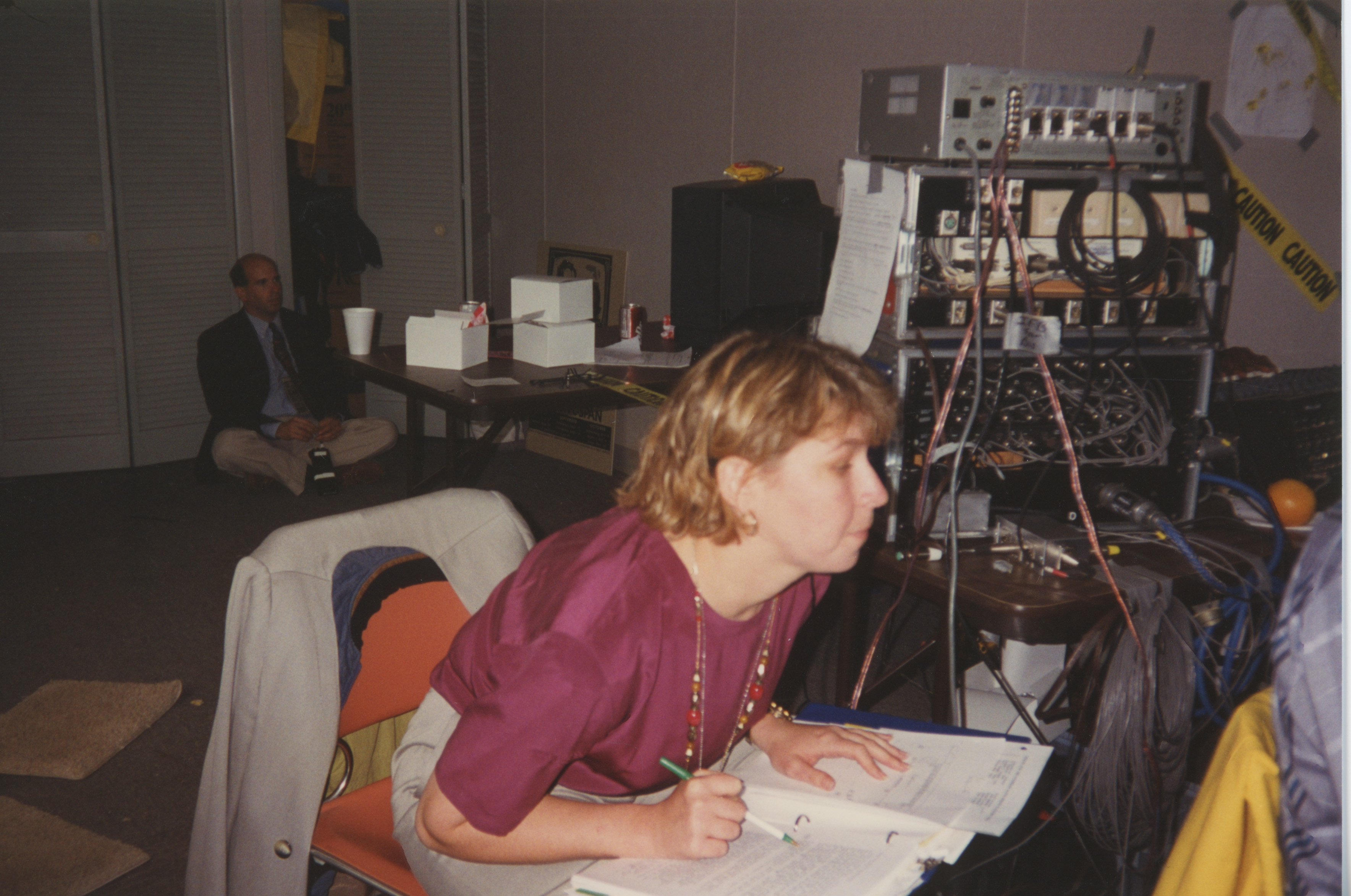 A person with a binder full of papers, sitting in a room with a lot of production equipment, leans forward to see something. This photograph was taken as part of filming C-SPAN's Lincoln-Douglas Debates series in Alton, Illinois.