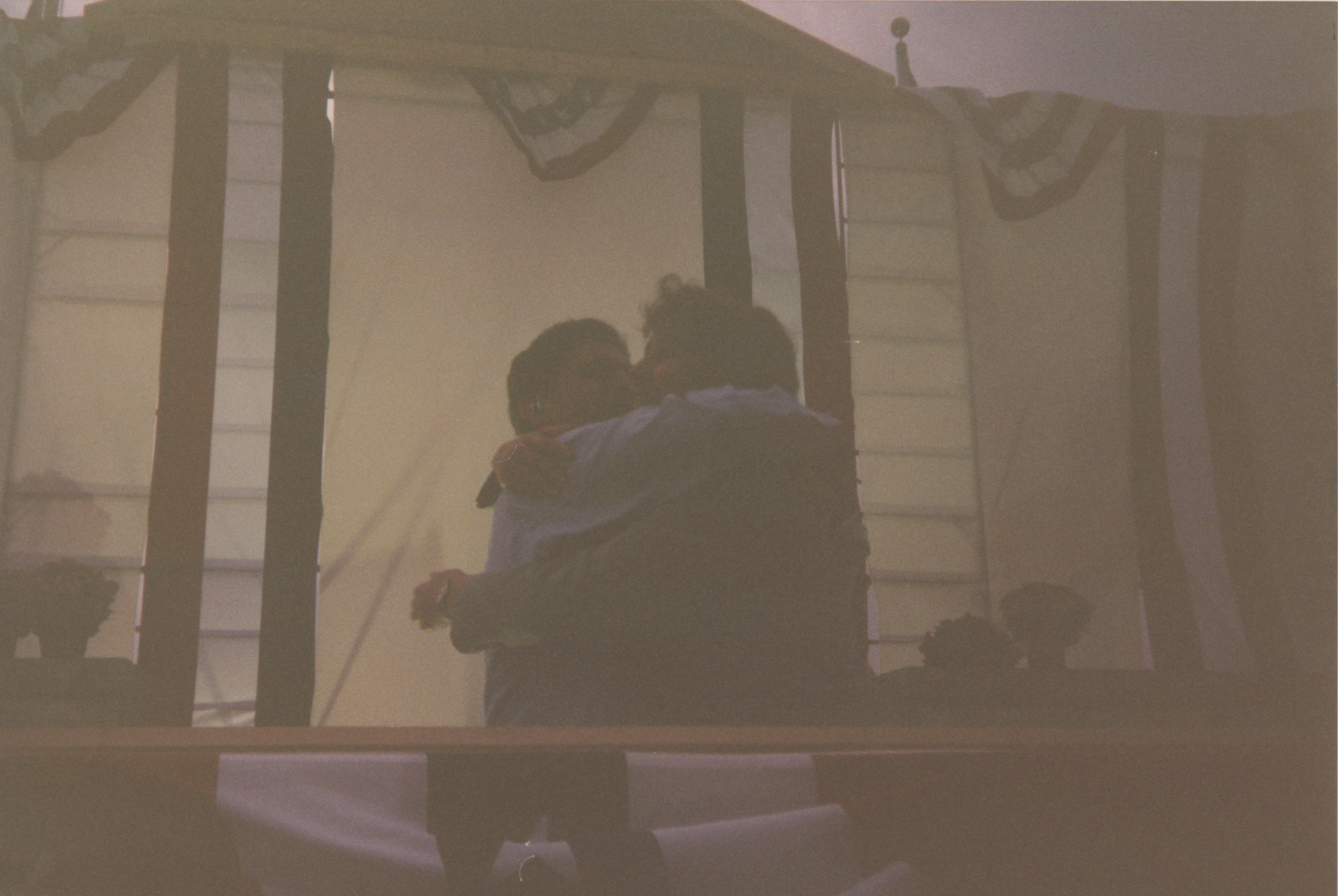Two people embrace on a platform adorned with red, white, and blue banners. This photograph was taken as part of filming C-SPAN's Lincoln-Douglas Debates series in Alton, Illinois.