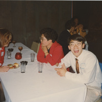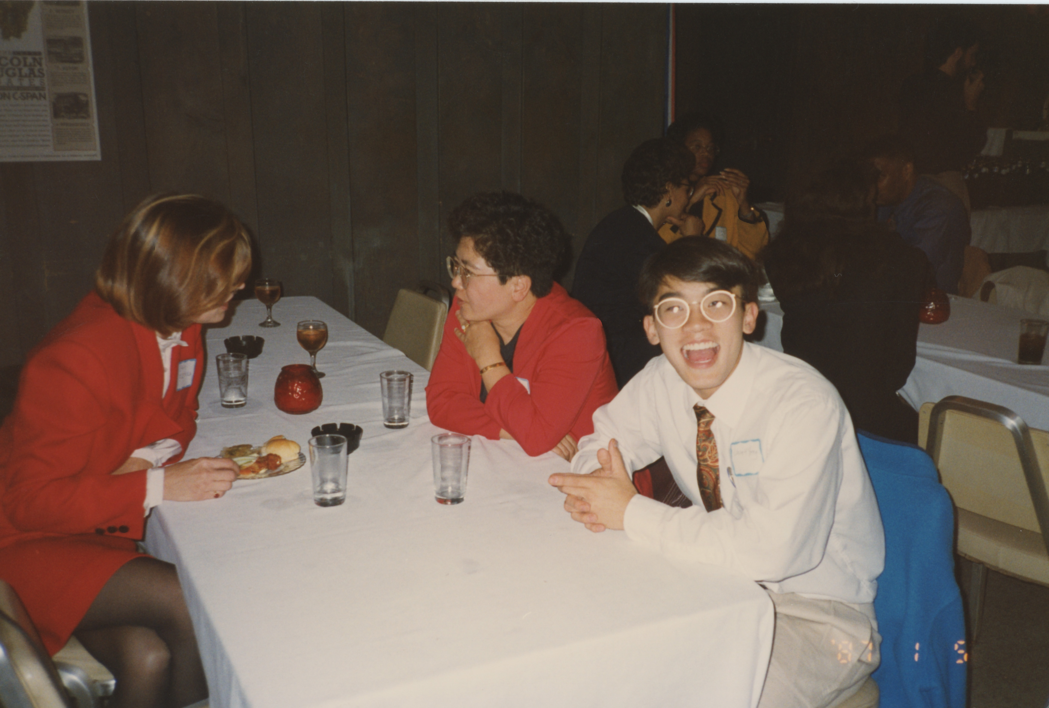 Three people sit around a white tableclothed restaurant table. This photograph was taken as part of filming C-SPAN's Lincoln-Douglas Debates series in Alton, Illinois.