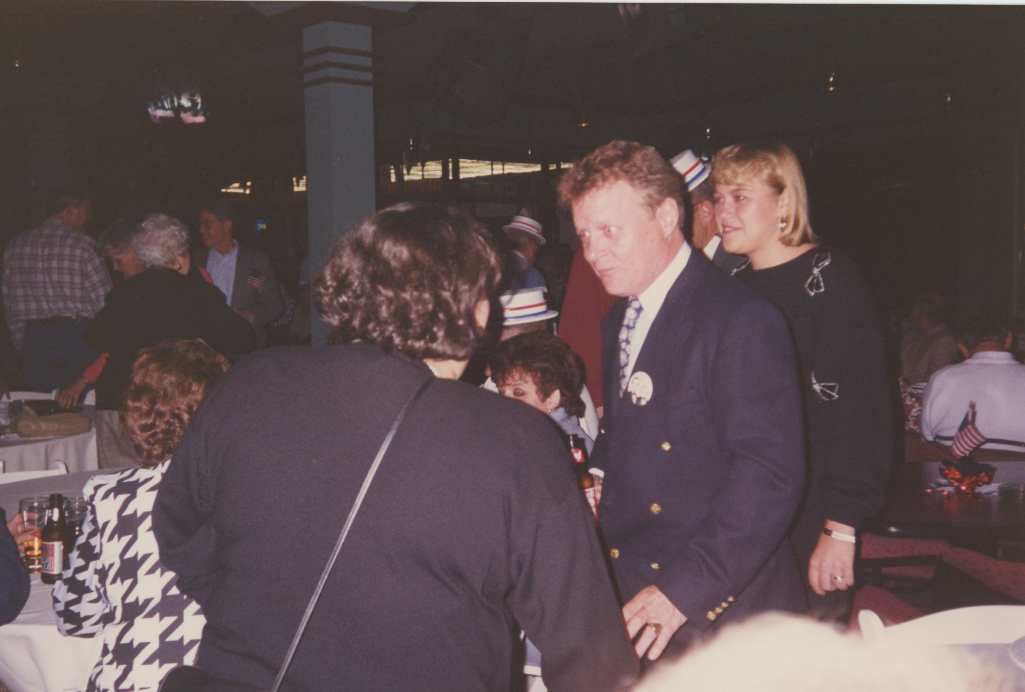 Someone speaks with a person whose back is to the camera in a crowded room where people sit at tables with refreshments. This photograph was taken as part of filming C-SPAN's Lincoln-Douglas Debates series in Alton, Illinois.