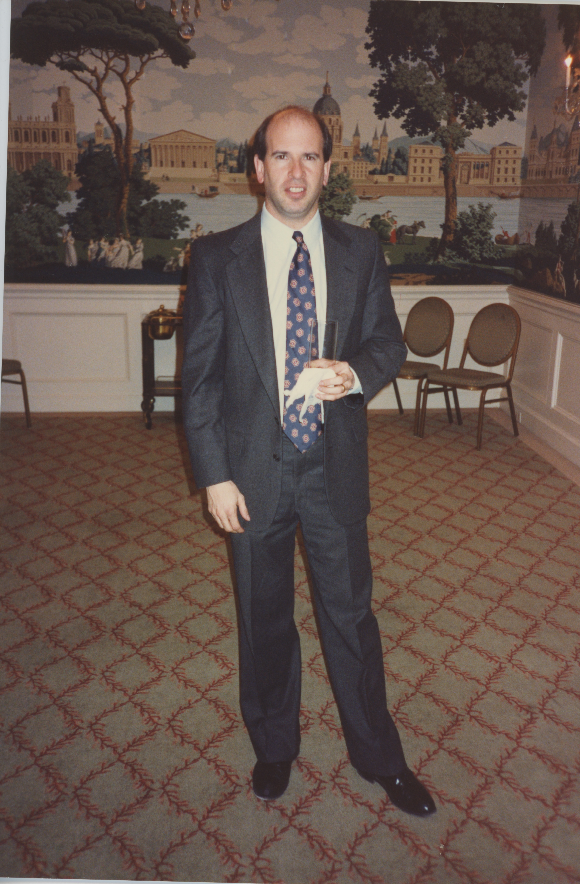A person holding a sandwich stands in a large room with painted murals on the walls. This photograph was taken as part of filming C-SPAN's Lincoln-Douglas Debates series in Alton, Illinois.
