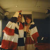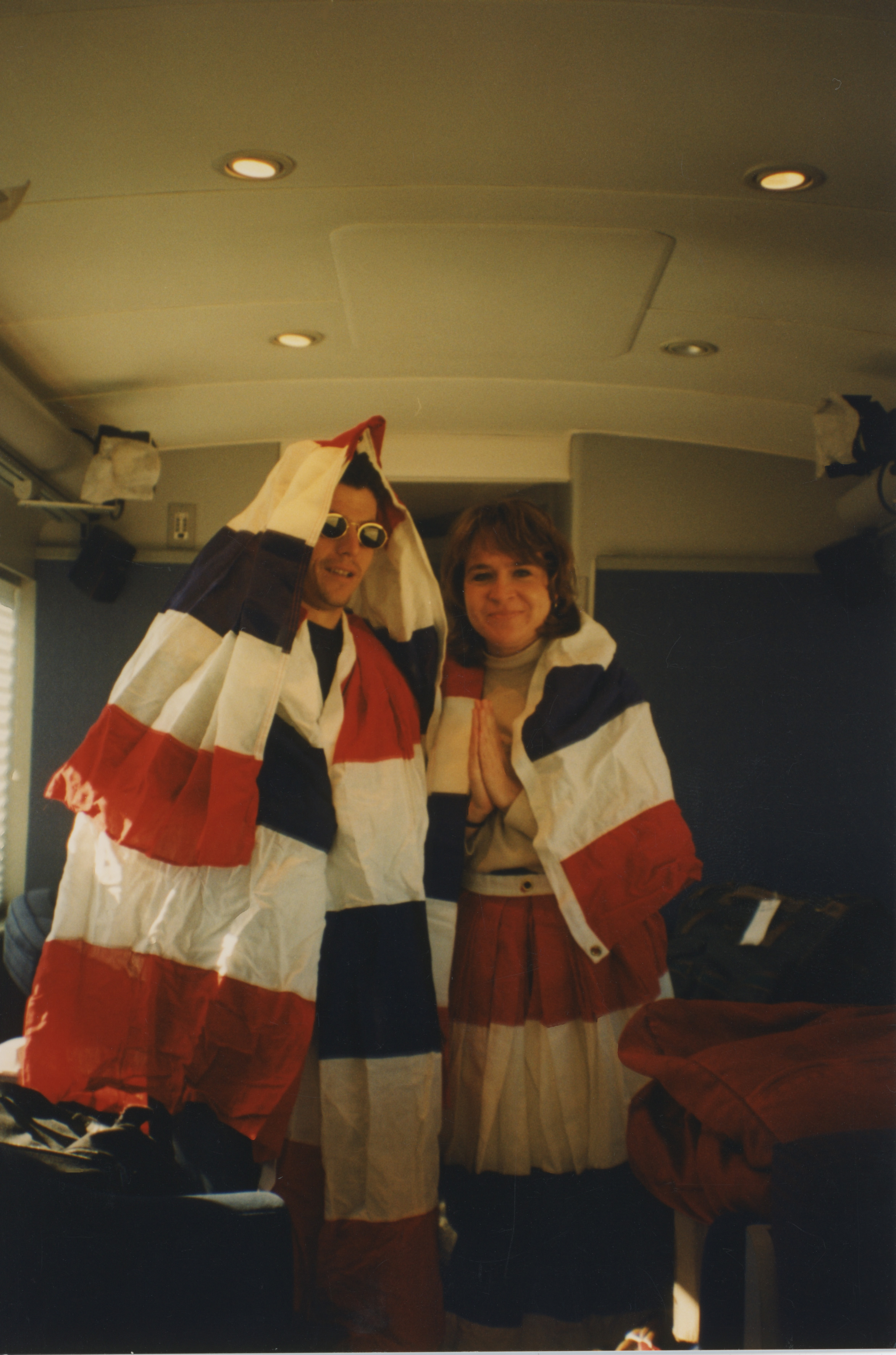 Two individuals pose wrapped in red, white, and blue banners. This photograph was taken as part of filming C-SPAN's Lincoln-Douglas Debates series in Alton, Illinois.