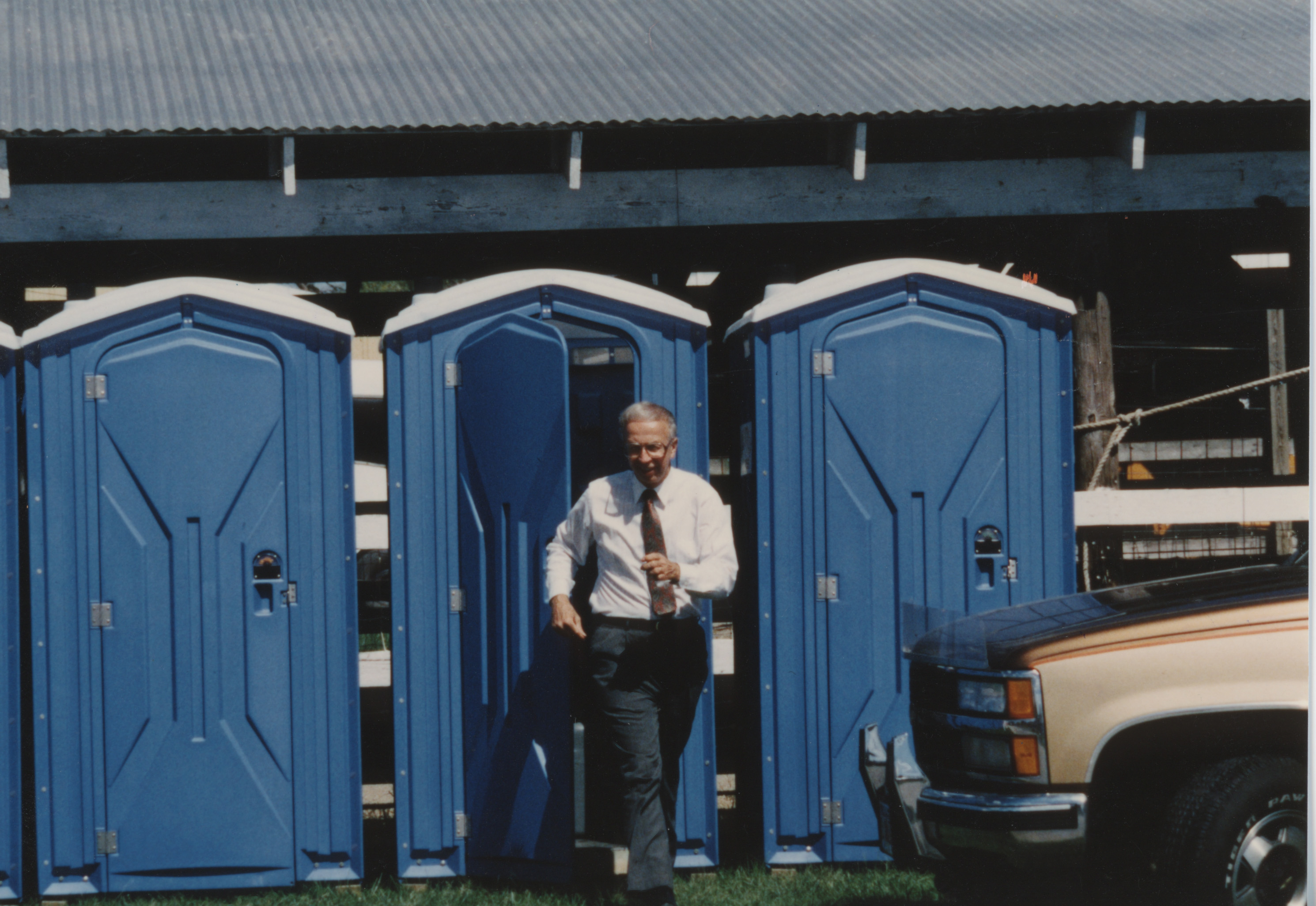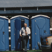 A person exits a portable latrine which is set up in a line of portable latrines. This photograph was taken as part of filming C-SPAN's Lincoln-Douglas Debates series in Alton, Illinois.