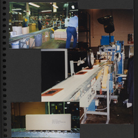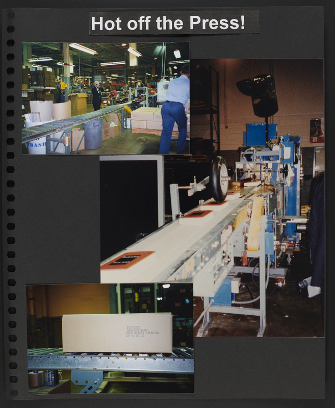 Scrapbook page titled "Hot off the Press!" with three photographs depicting the printing of the pages of the first Booknotes book. The images are of the men working in a printing room, a printing press with a conveyor belt of Booknotes books, and the spine of one copy of the Booknotes book.