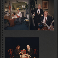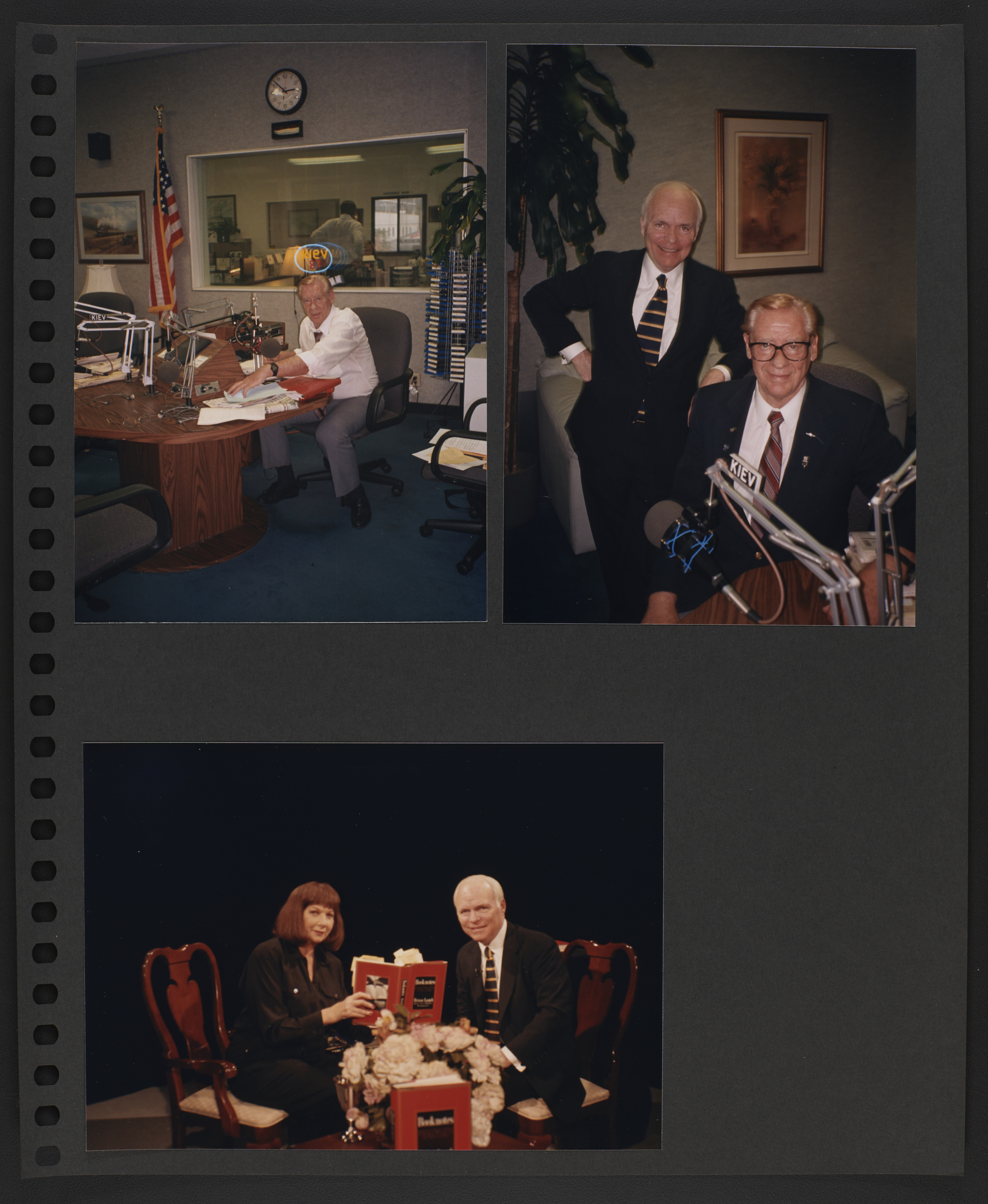 A scrapbook page of three photographs. The top left photograph is of a man in a room with some audio equipment, seated at a desk and arranging papers. The top right photograph is of Brian Lamb standing next to an unidentified person seated at a radio microphone. The bottom photo is of Brian Lamb and an unidentified person seated in a studio, holding open a copy of the first Booknotes book.