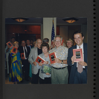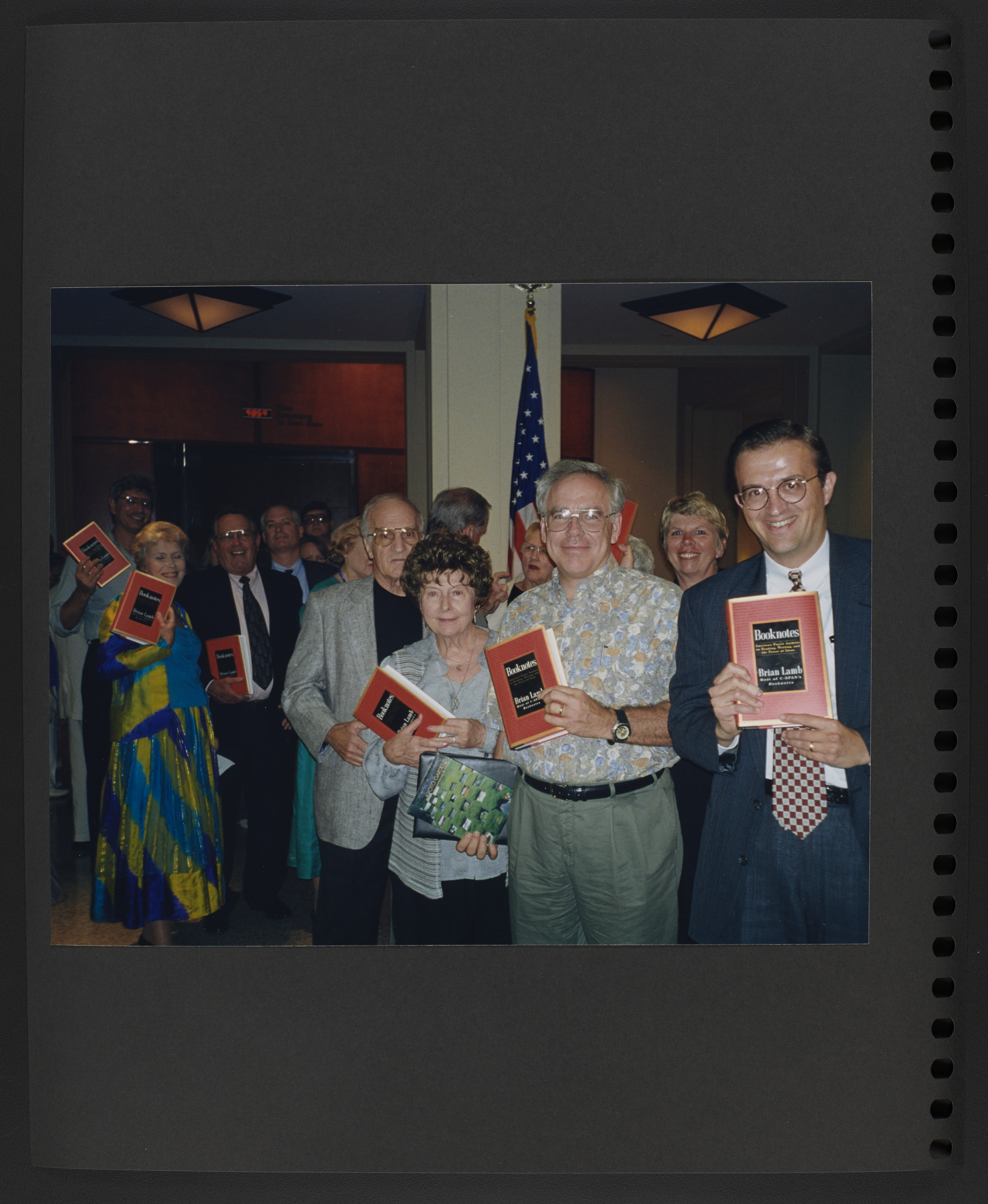 A scrapbook page with a photograph of a line of people, each holding up a copy of the original Booknotes book.