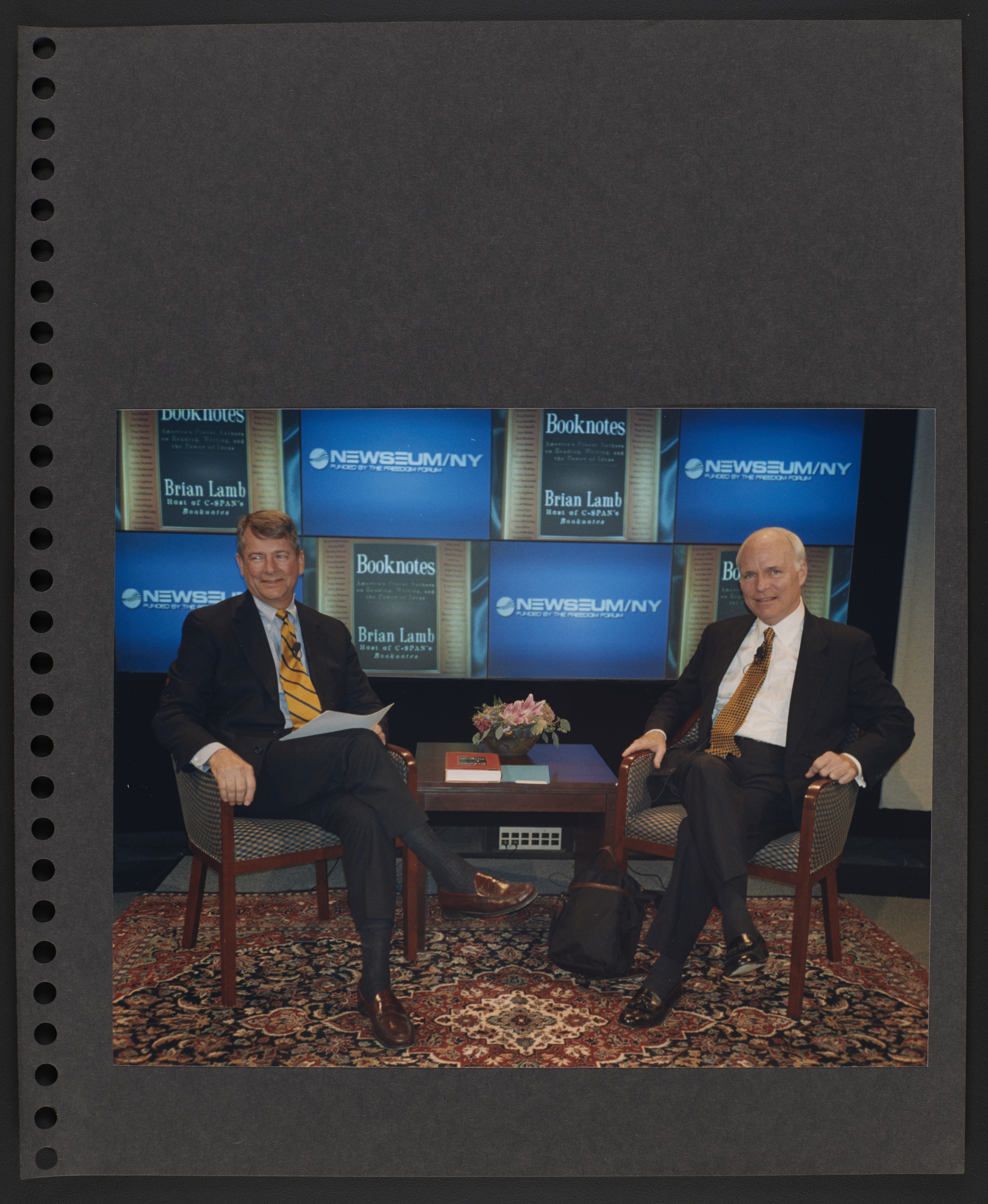 A scrapbook page featuring a photograph of Brian Lamb and another person sitting in a studio. Large screens in the background depict the cover of the first Booknotes book and the logo for Newseum/NY.