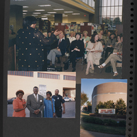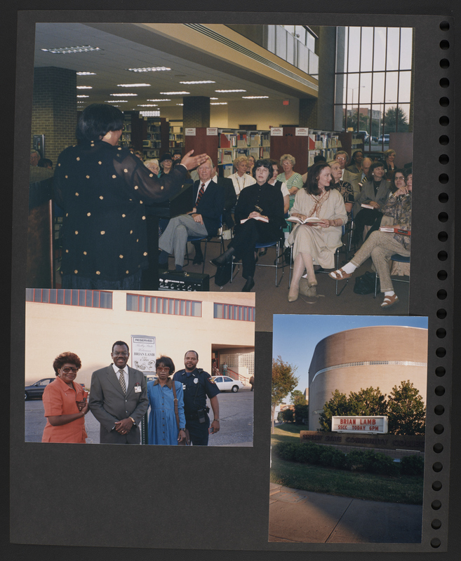 A scrapbook page with three photographs, commemorating an event with Brian Lamb. The top photograph depicts a person of color speaking to a small, seated group of people in what may be a library. The bottom left photograph depicts three people, one in a security uniform, posing for a photograph outside a building. The bottom right photograph depicts the outside of a building with an advertisement which reads "Brian Lamb, SSCC today 6pm."