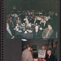 A scrapbook page with two photographs. The top photograph depicts a large crowd of people, all seated at various circular tables, in a large banquet hall. The bottom photograph is of Brian Lamb seated at a table signing copies of the first Booknotes book. A sign next to Lamb says "Author Signing Today."